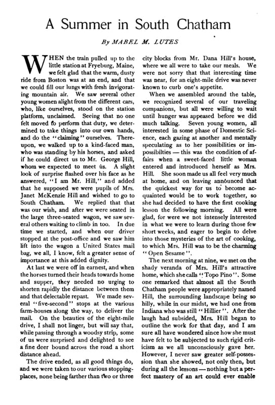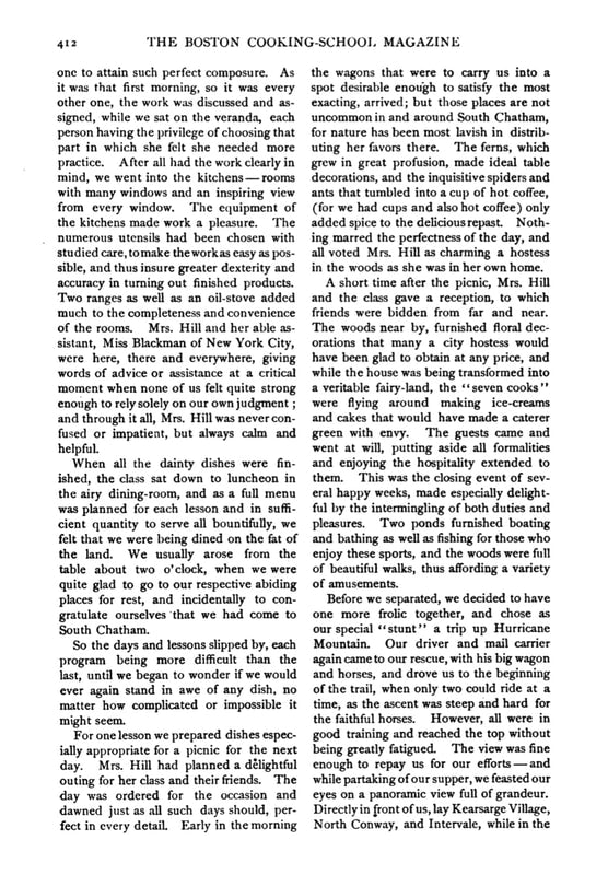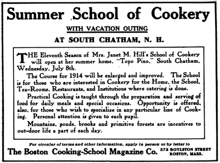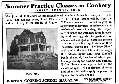 After graduating from the Boston Cooking School, she went on to establish her own Summer School of Cookery at Topo Pino, where she taught seasonal cooking in the natural setting of New Hampshire’s White Mountains. The school gained prominence following the 1896 publication of The Boston Cooking School Cook Book by Fannie Merritt Farmer, who had been the principal of the Boston Cooking School during Hill’s time there.