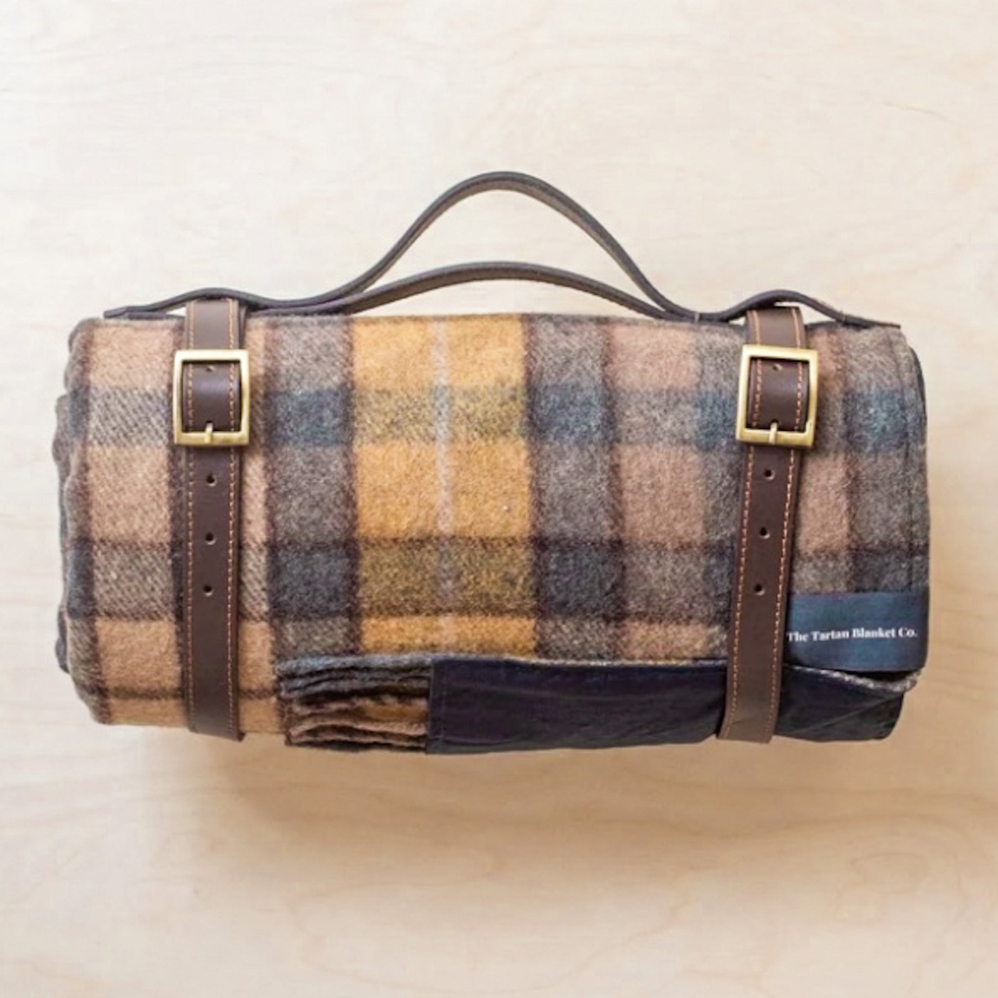 Brass and leather carrying strap for picnic blanket. The perfect complement to your recycled wool picnic blanket.