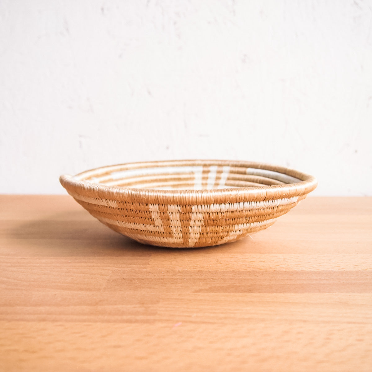 This beautiful 8" in diameter sisal woven basket was woven by female artisans in Gitarama, Rwanda. The women extract the sisal fibers from agave plants, then hand-dye and weave them into these works of art. The sisal is woven around sweetgrass, a fragrant grass with a subtle sweetness. Each sisal Rwandan basket comes with a string attached to the back for easy wall hanging. In addition to making a beautiful table display, these baskets can be hung as art. You can combine them with other baskets or works of art to create a feature wall collage.