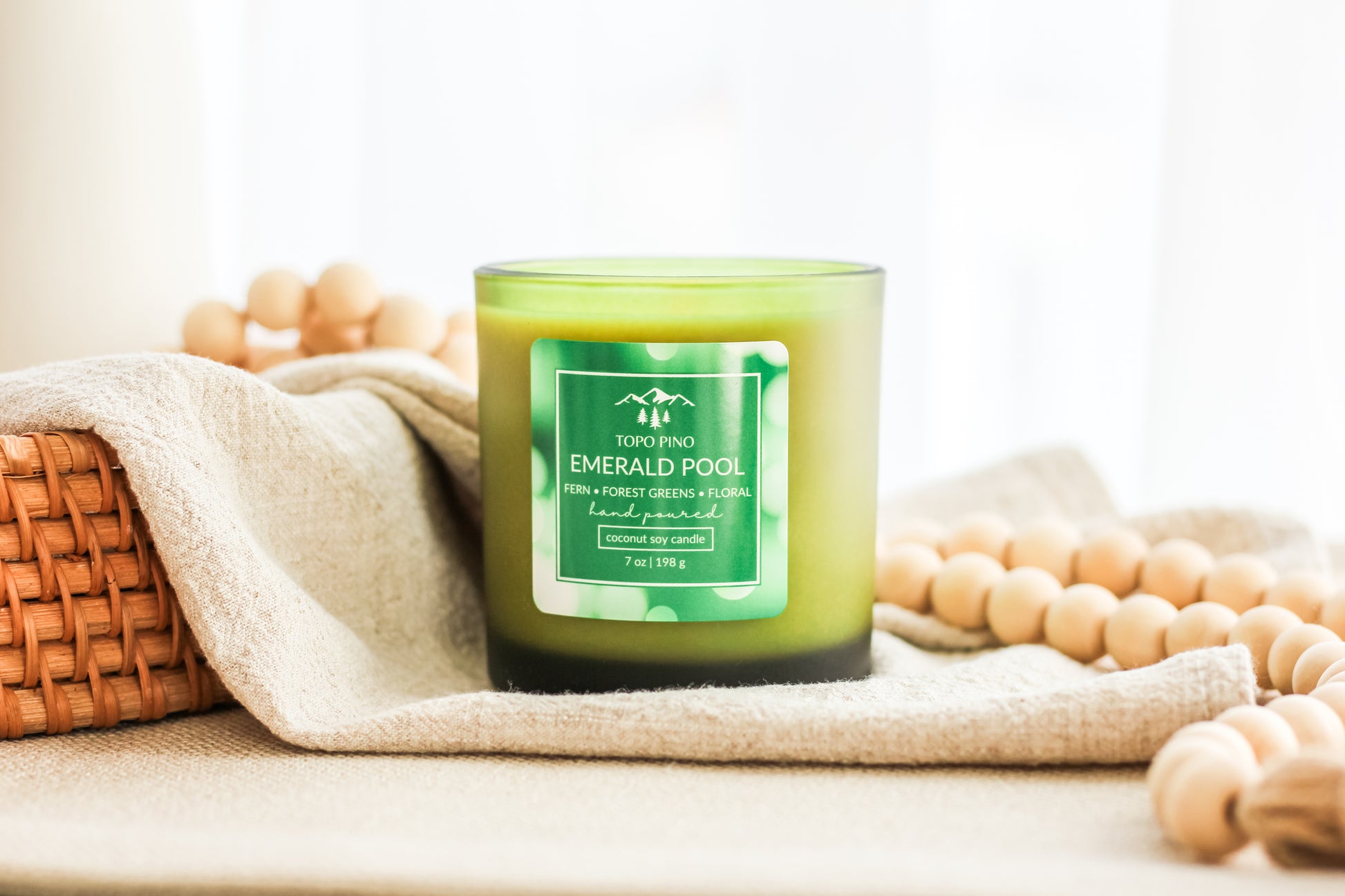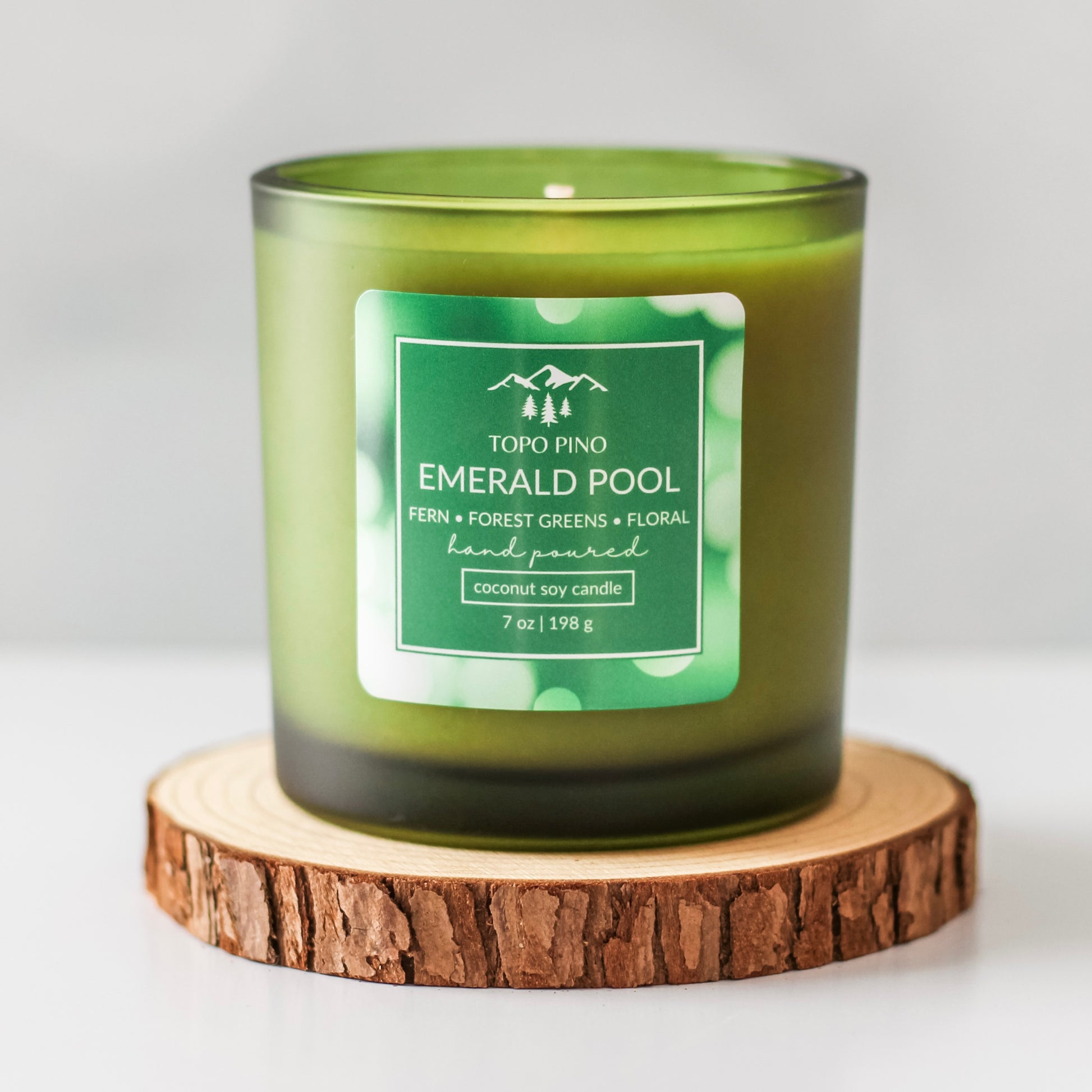 Let the Topo Pino's Emerald Pool 7 oz candle kindle your spirit of adventure. Fern, forest greens, and floral scent notes will inspire you to embark on a journey to a natural emerald pool hidden deep in the serene forest.