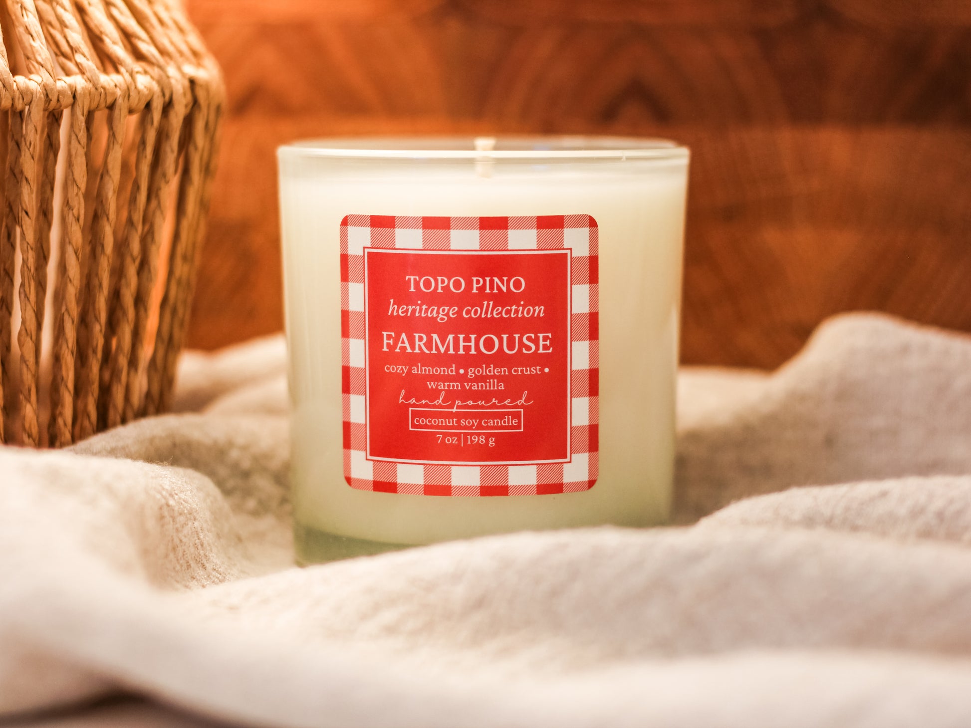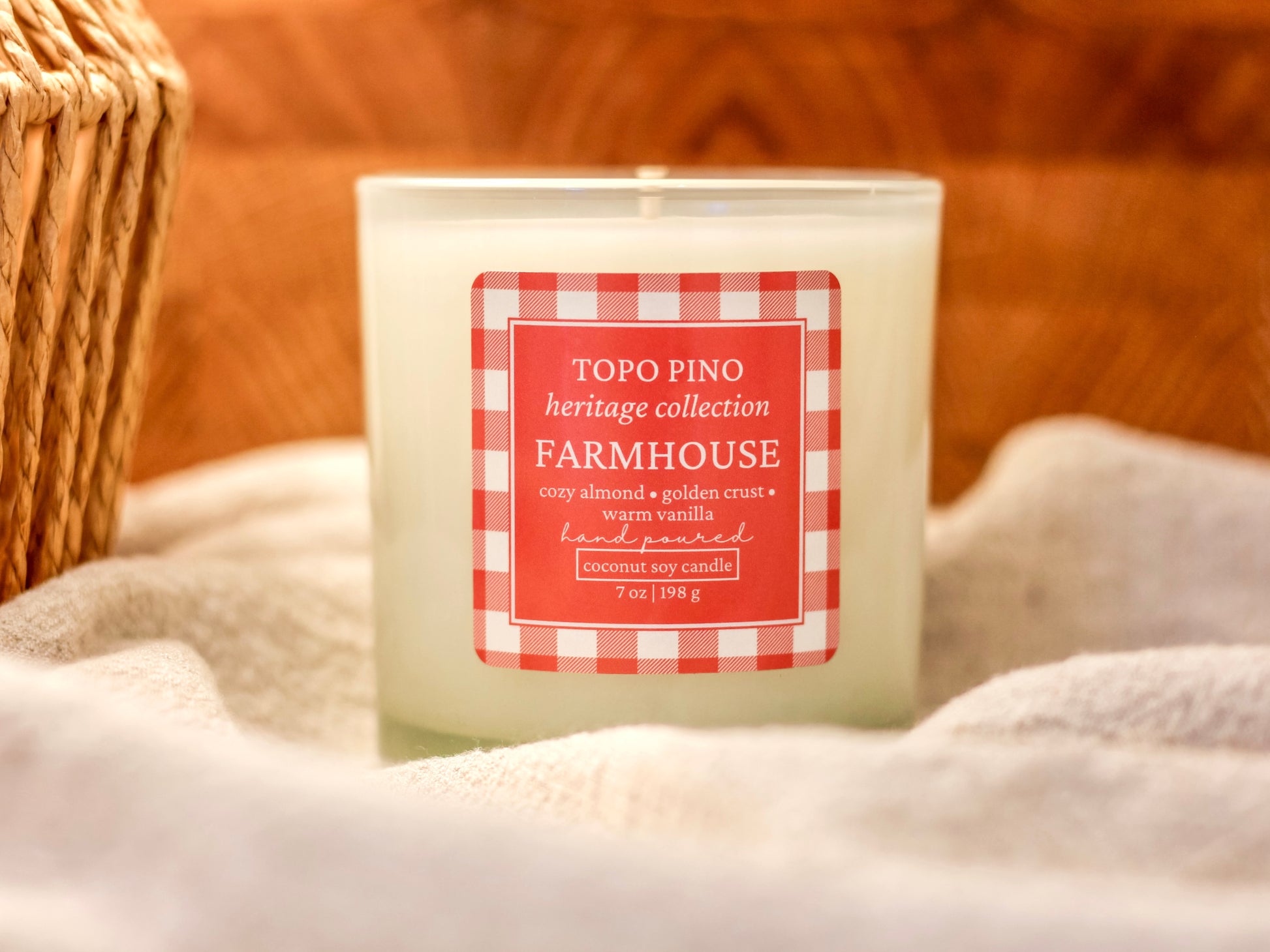 Inspired by the simple pleasures of life at Topo Pino, Farmhouse captures the soul of a home shaped by the land—bread baking in the oven, sun-warmed floorboards underfoot, and the scent of herbs gathered from the garden. Available exclusively in our 7 oz size, this candle brings a breath of rustic comfort to any space, honoring a place where seasons guide the day and every corner tells a story.