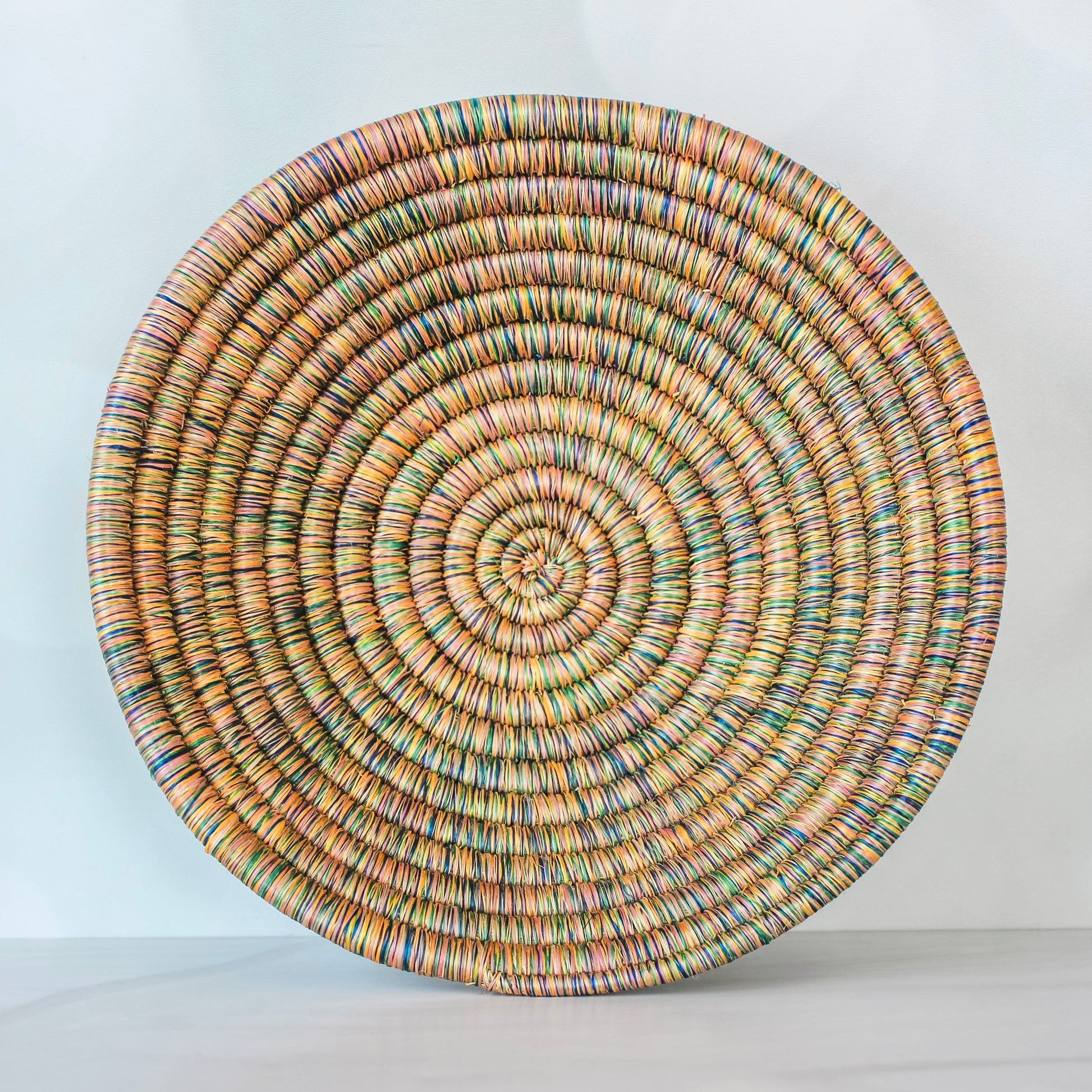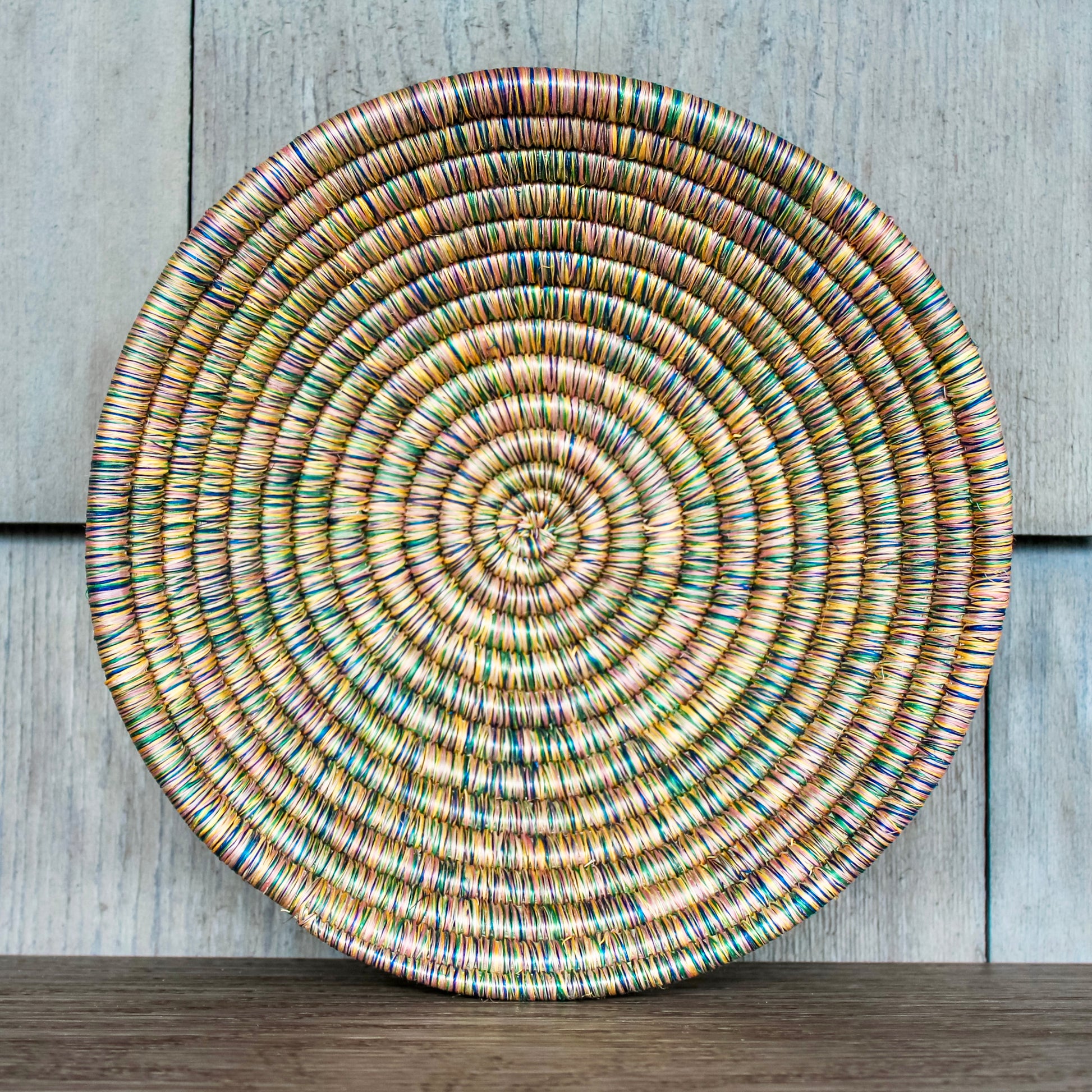 This beautiful 8" in diameter sisal woven basket was woven by female artisans in Gitarama, Rwanda. The women extract the sisal fibers from agave plants, then hand-dye and weave them into these works of art. The sisal is woven around sweetgrass, a fragrant grass with a subtle sweetness. Each sisal Rwandan basket has a string attached to the back for easy wall hanging. In addition to making a beautiful table display, these baskets can be hung as art. You can combine them with other baskets or works of art to create a feature wall collage.