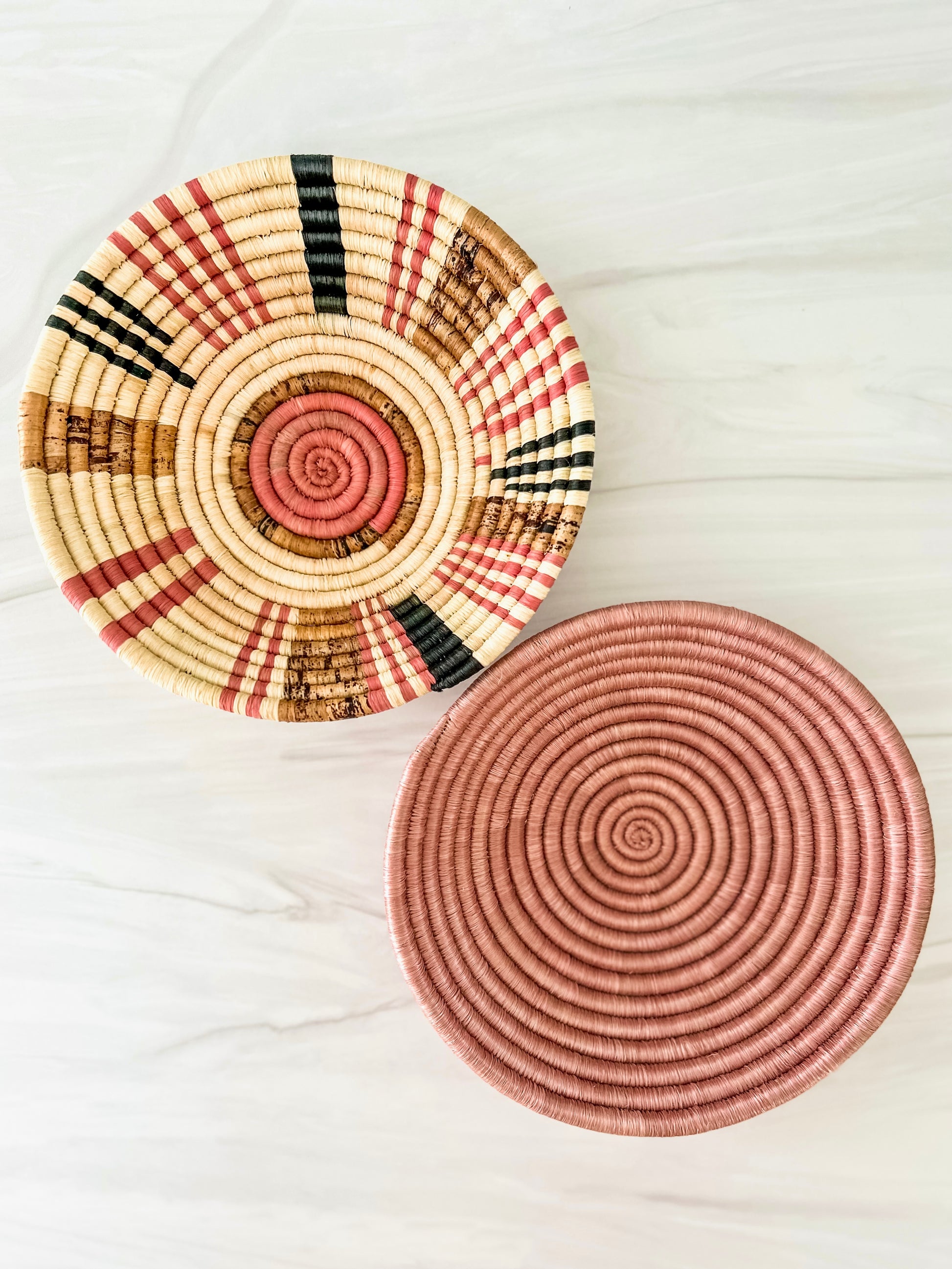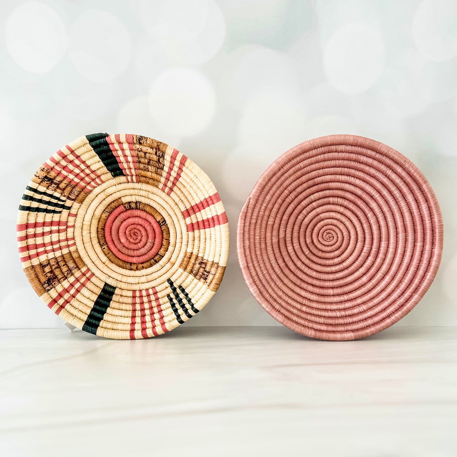 This beautiful 8" in diameter sisal woven basket was woven by female artisans in Gitarama, Rwanda. The women extract the sisal fibers from agave plants, then hand-dye and weave them into these works of art. The sisal is woven around sweetgrass, a fragrant grass with a subtle sweetness. Each sisal Rwandan basket has a string attached to the back for easy wall hanging. In addition to making a beautiful table display, these baskets can be hung as art. You can combine them with other baskets or works of art to create a feature wall collage.