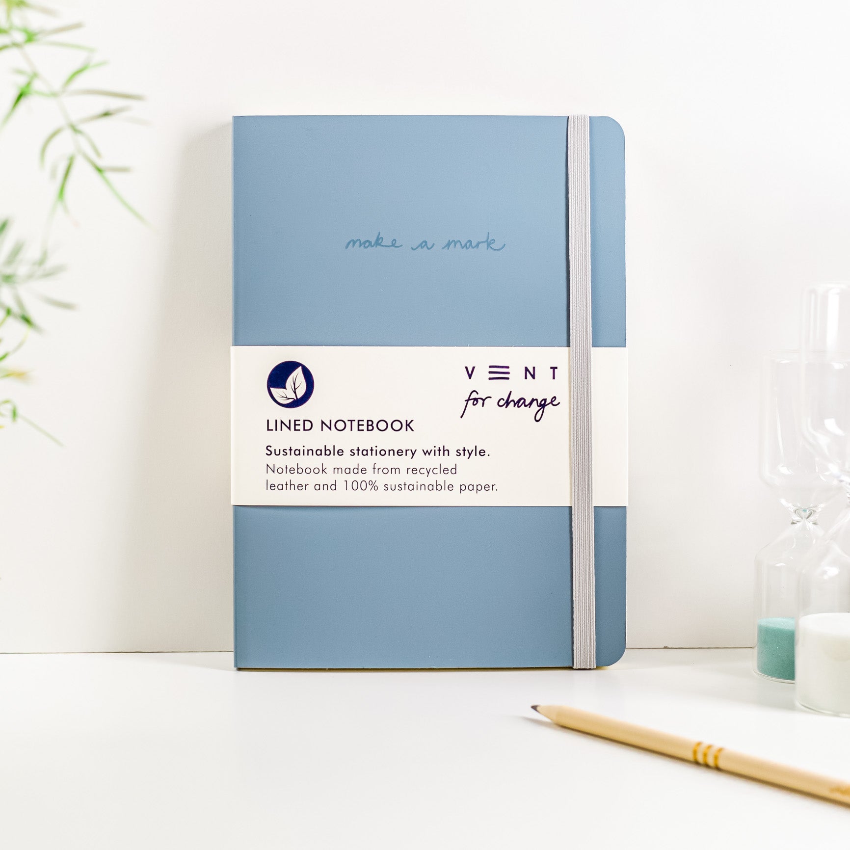 A beautiful notebook made with a recycled leather cover and 100% sustainable standard weight paper. Subtly debossed front cover with Make a Mark and elastic book closure. Ethically produced with 192 pages of ivory colored (off-white) lined paper.