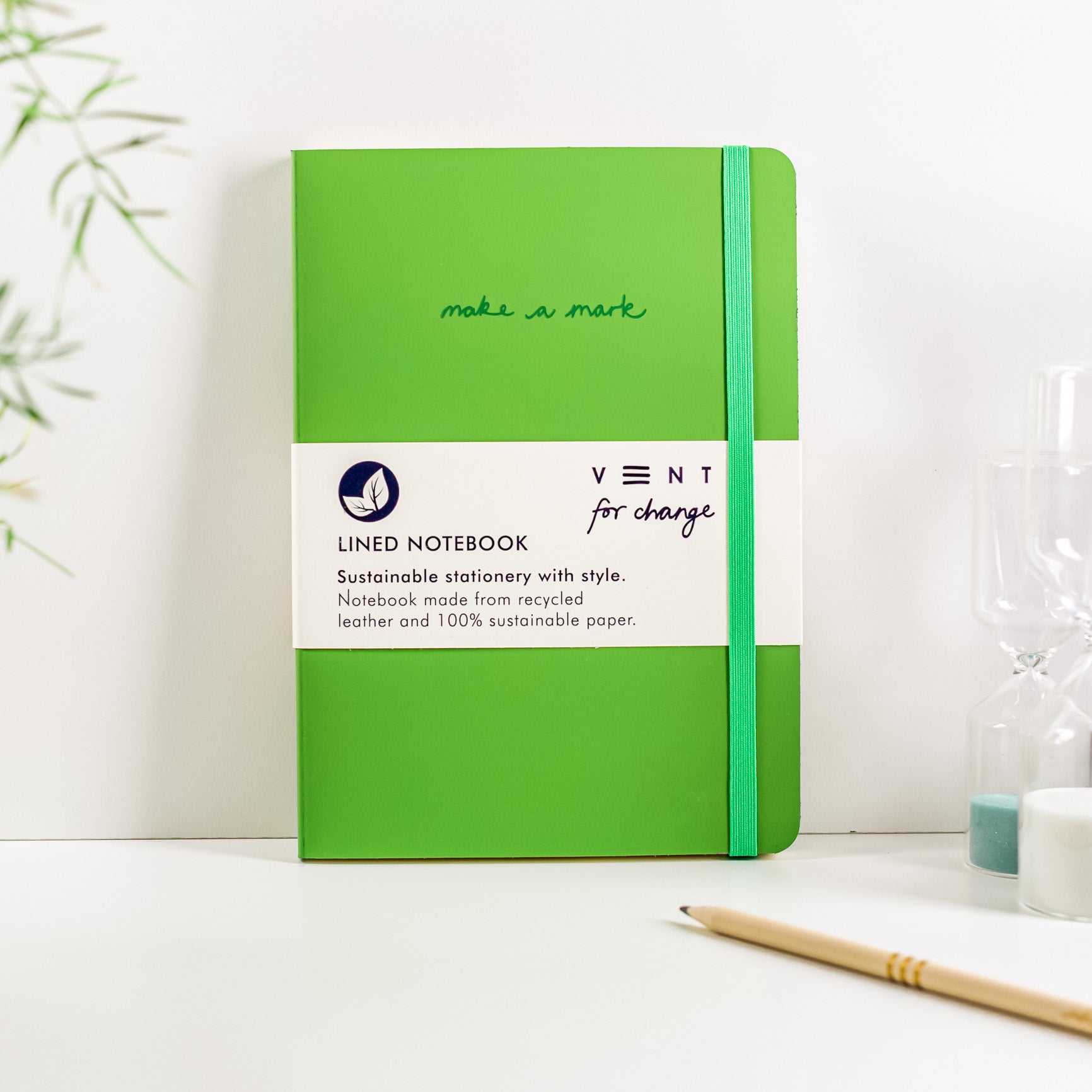 A beautiful notebook made with a recycled leather cover and 100% sustainable standard weight paper. Subtly debossed front cover with Make a Mark and elastic book closure. Ethically produced with 192 pages of ivory colored (off-white) lined paper.