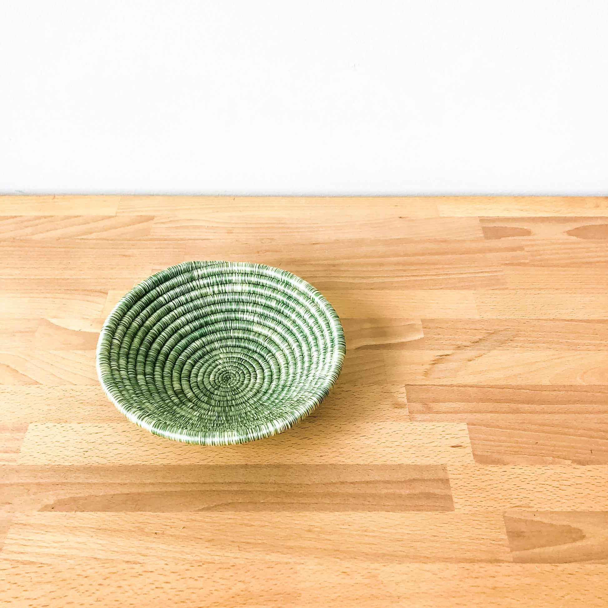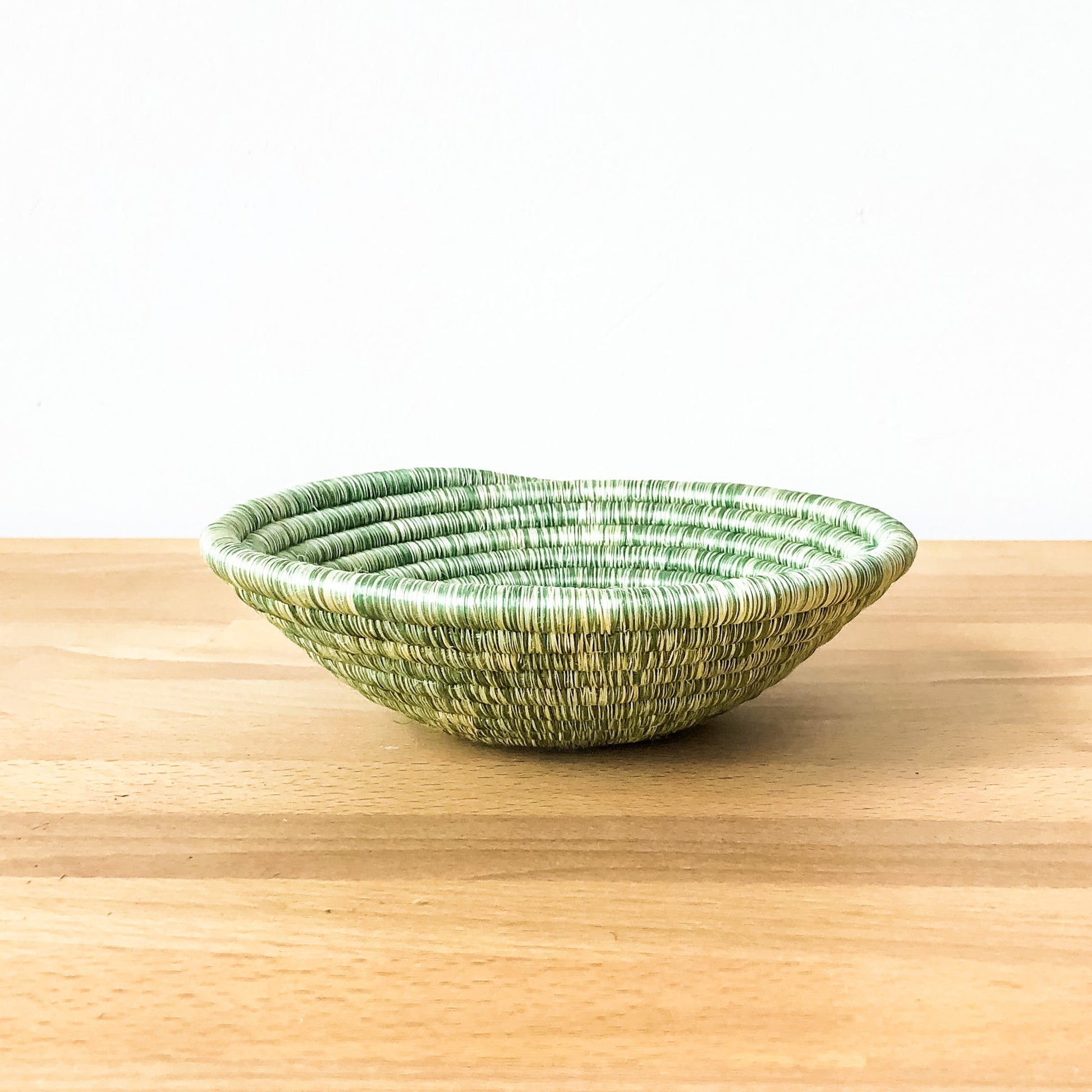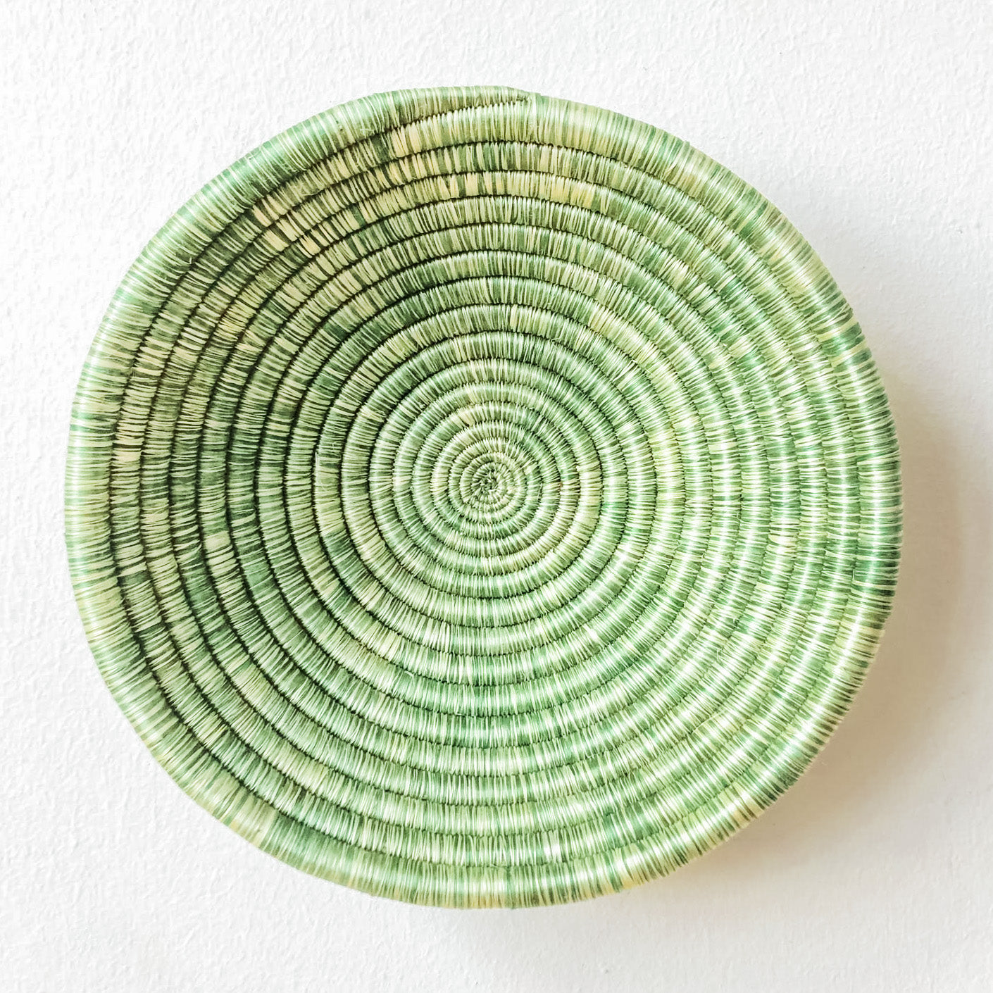 This beautiful 8" in diameter sisal woven basket was woven by female artisans in Gitarama, Rwanda. The women extract the sisal fibers from agave plants, then hand-dye and weave them into these works of art. The sisal is woven around sweetgrass, a fragrant grass with a subtle sweetness. Each sisal Rwandan basket comes with a string attached to the back for easy wall hanging. In addition to making a beautiful table display, these baskets can also be hung as art. You can combine them with other baskets or works of art to make a feature wall collage.